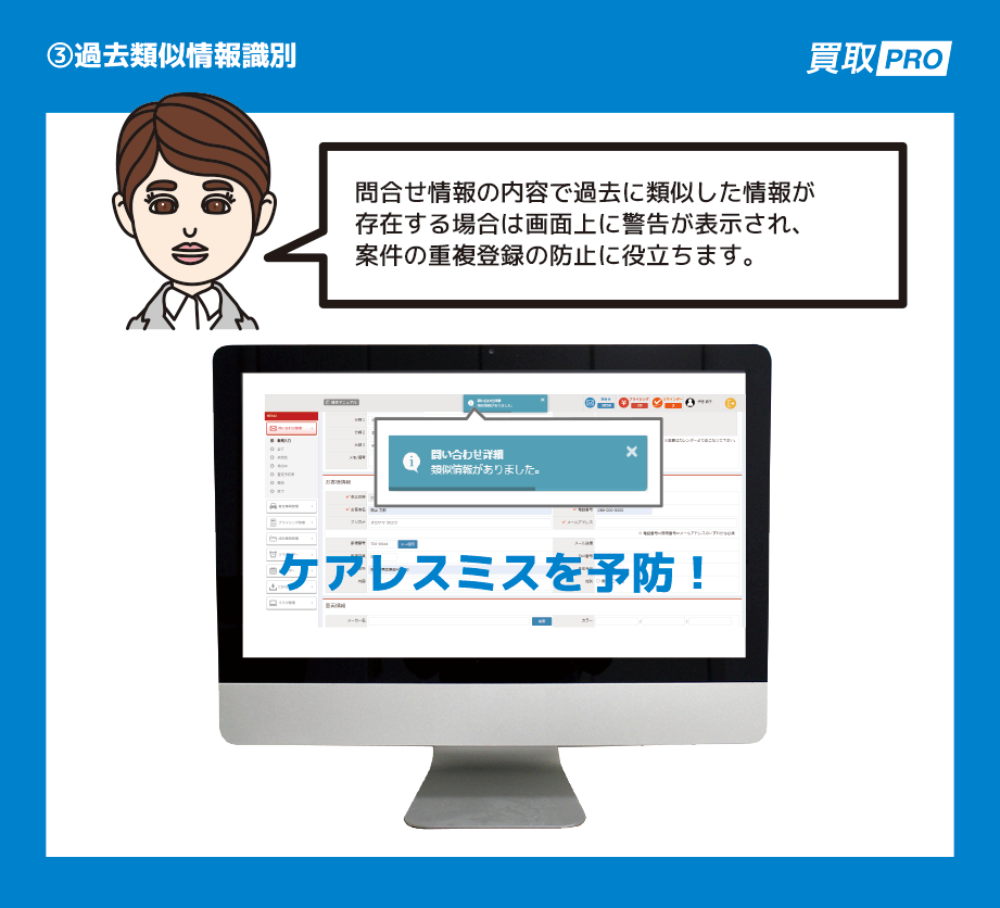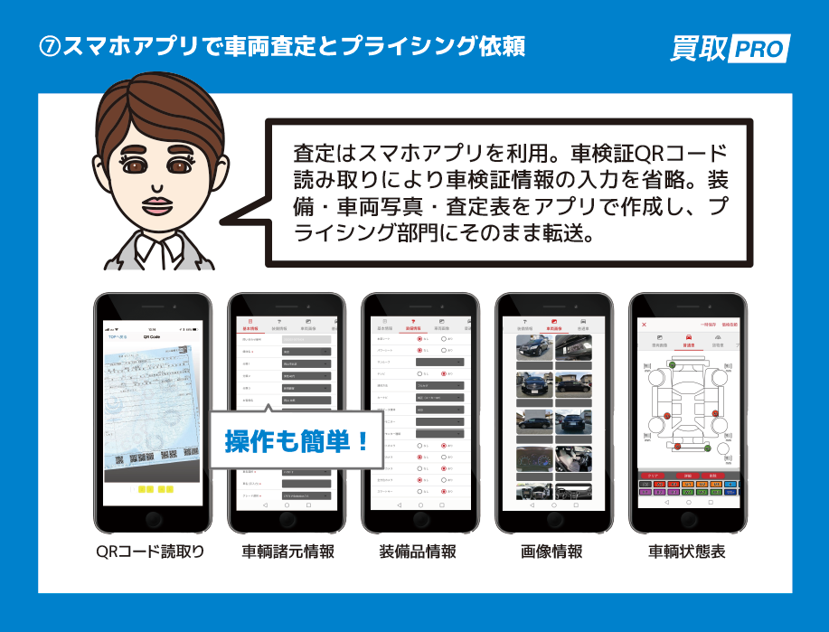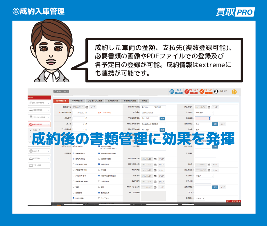 買取PROは、出来るだけシンプルな画面構成にしており、パソコンが苦手な方でも安心して取り組んで頂けます。また、導入に際しては、車検業務に熟知した専門スタッフが現地訪問してサポートいたします。